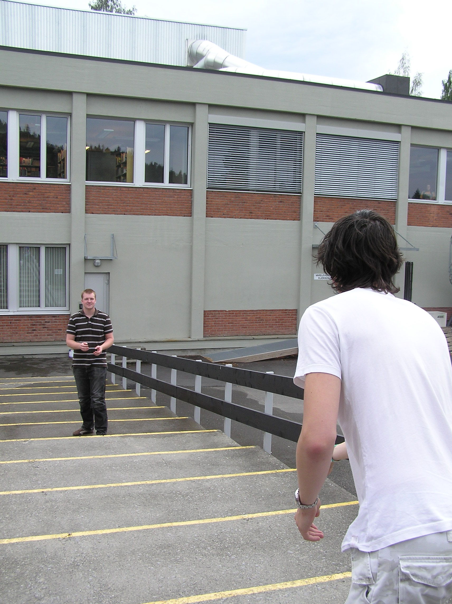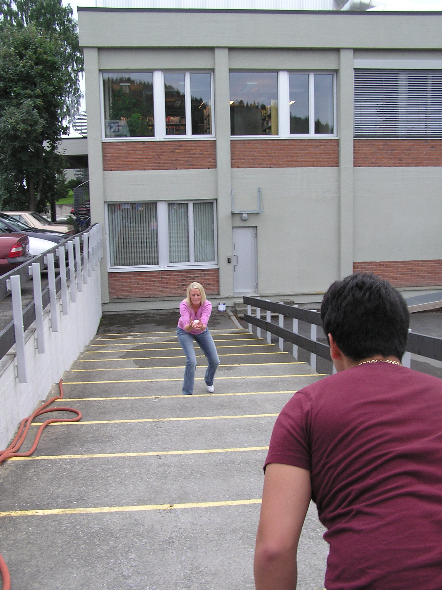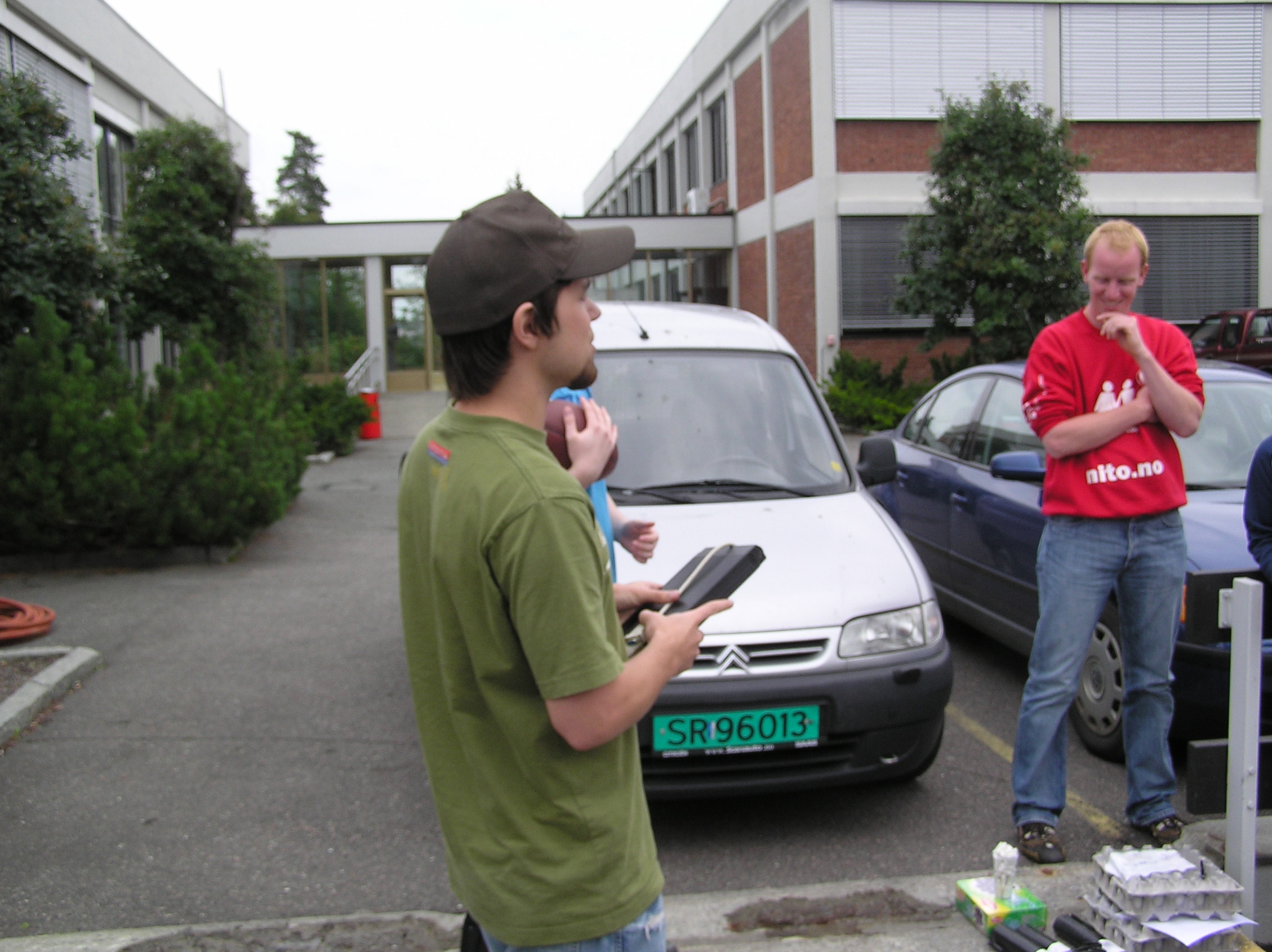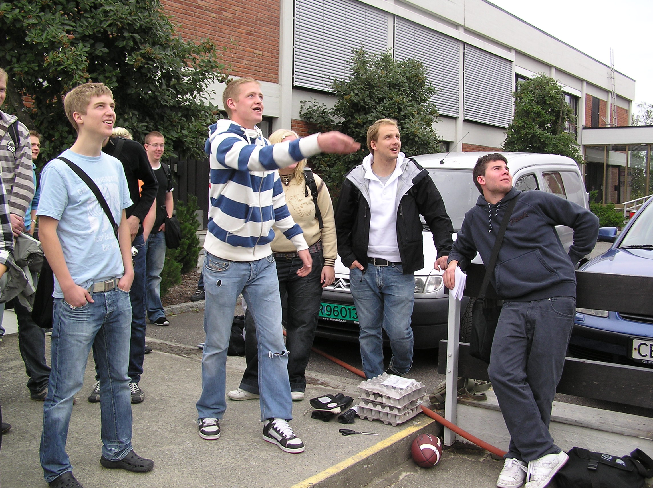 Vi hadde gått til innkjøp av en større mengde egg, noen bossekker, og lånte Økonomi(u)ansvarliges saks for anledningen. Siden kastegruppa anerkjenner at mottaket kan være en viktig del av kastet, ble poeng gitt for mottak i oppgaven vår. Gruppene kunne få maksimalt fem poeng, og fikk ett poeng per trappetrinn egget passerte på vei mot mottakeren. Dersom det endret egenskaper ved mottak (knuste i hånden på mottaker) ble de trukket to poeng. Dersom de valgte å ikle seg bossekker for å unngå å bli tilgriset, ble de også trukket to poeng.